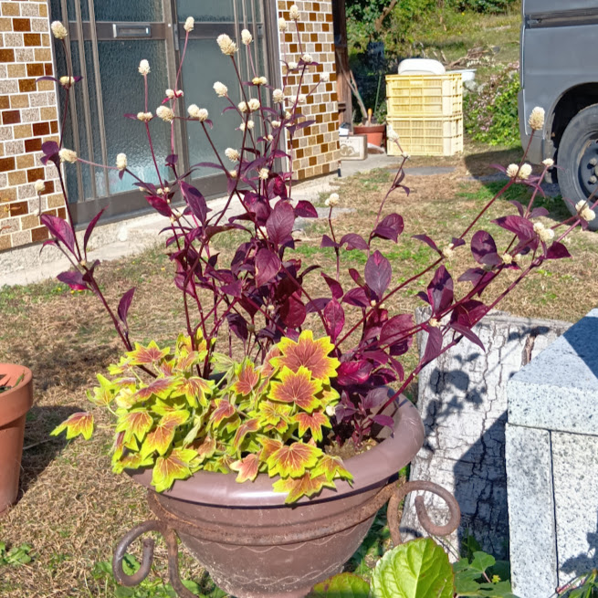最近寄せ植えた。紅葉葉と赤いヤツ